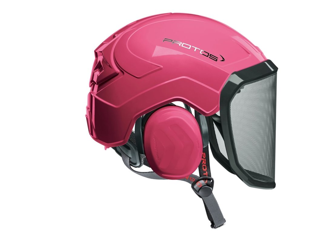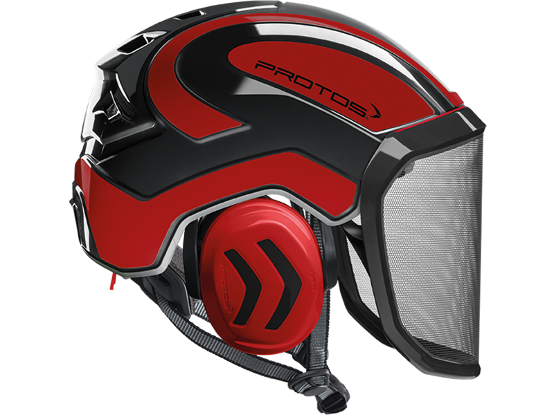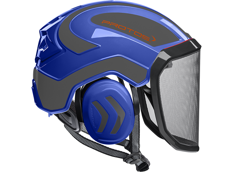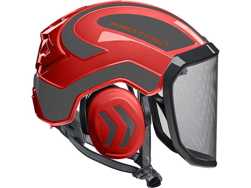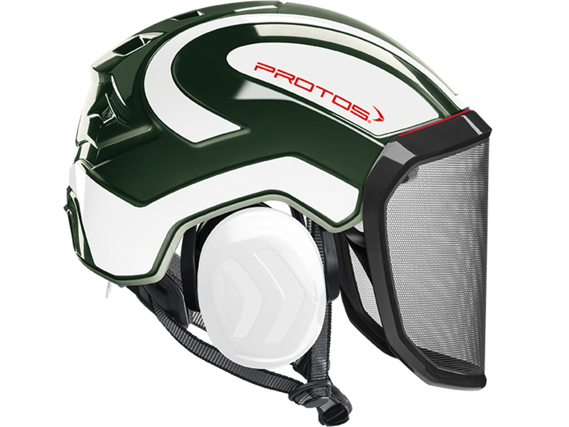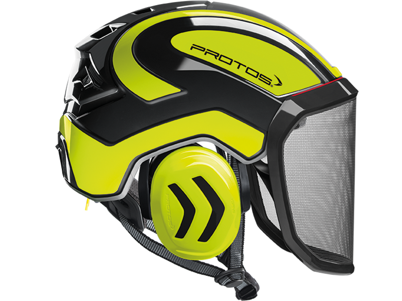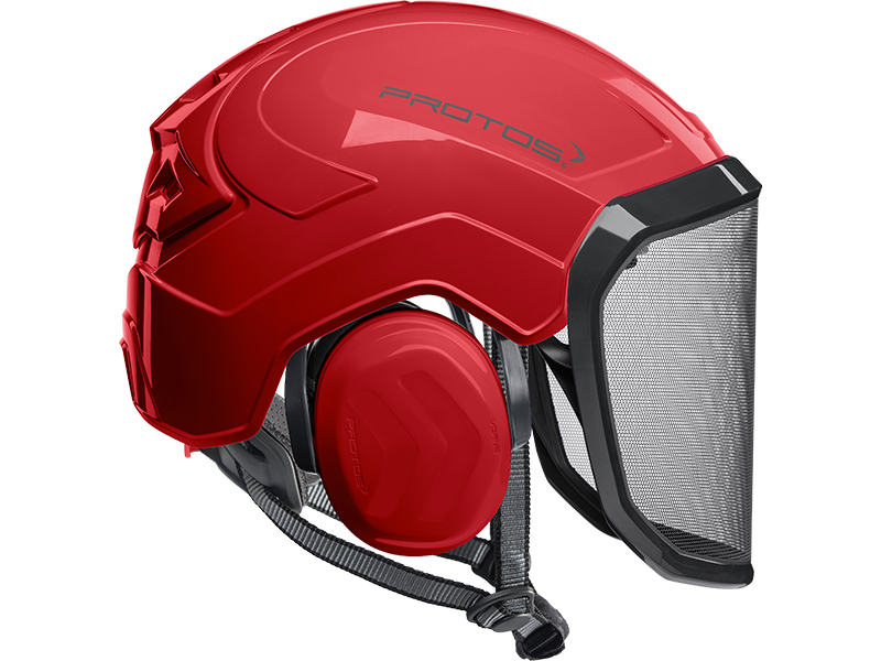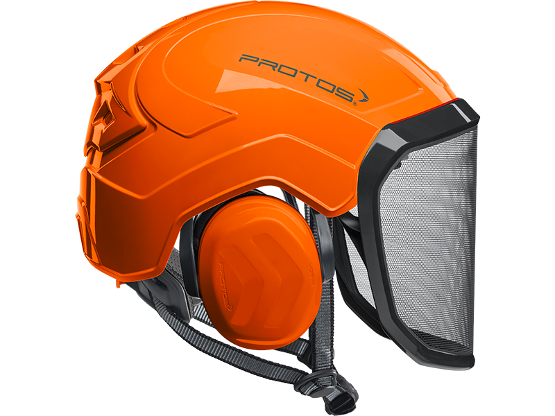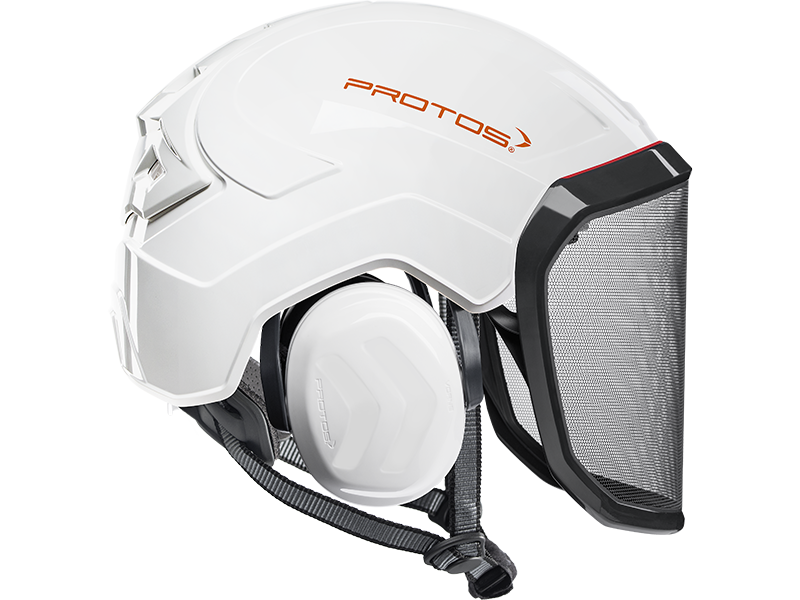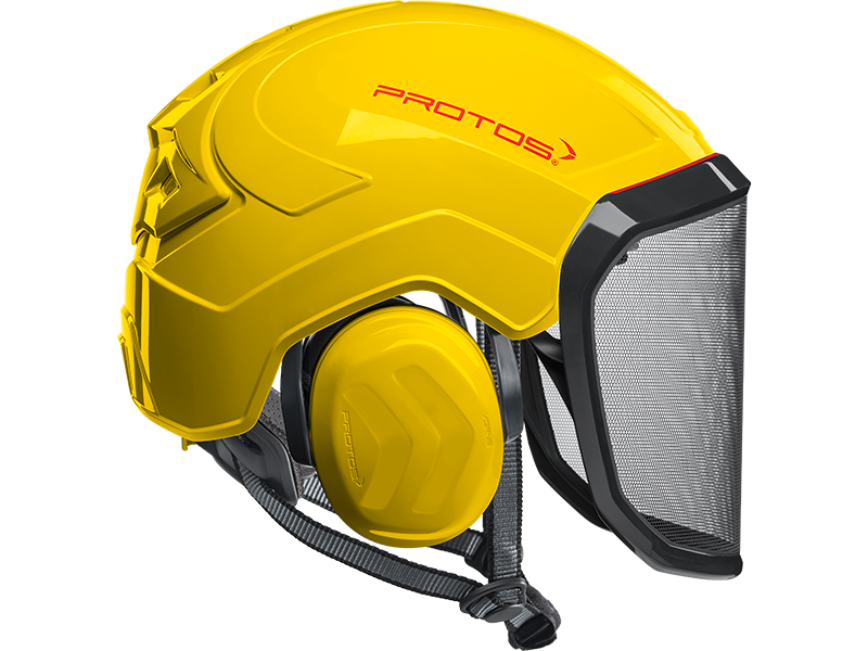 The perfect fit and optimum hold of the PROTOS® Integral Arborist make it perfect for work at height, where face protection is indispensable. The hearing and face protection are integrated into the shell of the head protection and thereby prevent snagging on branches and protruding parts. The special design of the PROTOS® Integral allows the cooling air to flow in from all sides and to escape through the ventilation gate. This ensures that the head does not over heat even during the most strenuous activities. After tiring work the KlimaAIR® Set can be exchanged and washed at 30° C to maintain the hygiene. The guide of the chin strap is designed so that it cannot slip under the hearing protection where it would affect the noise reduction or the wearing comfort. The PROTOS® Integral Arborist is of course certified according to EN 397 and EN 12492 which embodies AS/NZ1801.